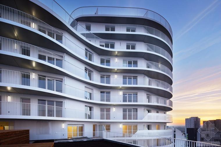 這是一棟建造于核心區(qū)位的獨(dú)特建筑。New’R大樓由流線型的折角和四周波浪起伏的陽(yáng)臺(tái)構(gòu)成,這樣的造型設(shè)計(jì)不僅是在向奧斯卡•尼邁耶致敬,還是在向上世紀(jì)七十年代法國(guó)里維埃拉的建筑(例如由André Minangoy 和 Michel Marot設(shè)計(jì)的天使灣碼頭)致敬,最后還暗示了快樂(lè)主義者對(duì)邁阿密海灘的幻想。這座建筑顯得感性而又賦有多向性,其所在位置在“畢加索郵路”和目前沿鐵路基礎(chǔ)設(shè)施設(shè)置的、尚處于開(kāi)發(fā)階段的新住區(qū)之間的重要節(jié)點(diǎn)上。New’R大樓對(duì)現(xiàn)有場(chǎng)地的構(gòu)建體現(xiàn)在對(duì)基地形成的環(huán)擁之勢(shì)和對(duì)新景觀的塑造。